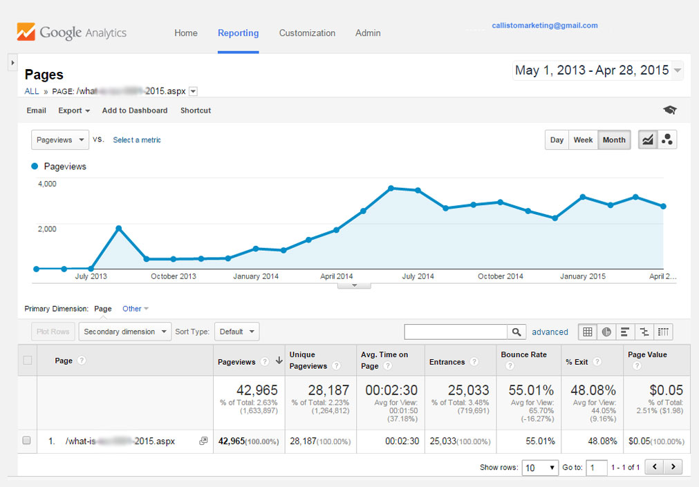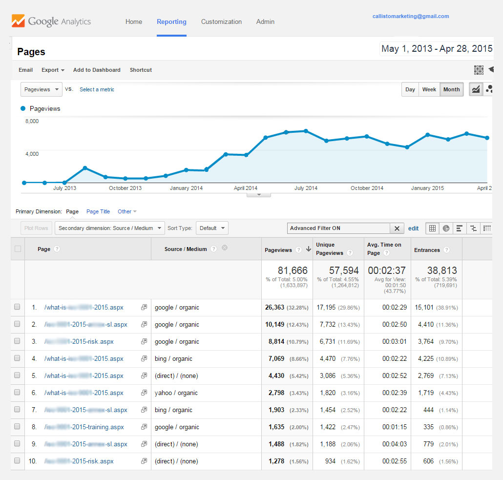 - Over 58,000 unique visitors from only 8 article posts with an equivalent cost per click of less than six cents (PPC for this business area can range from $1.00 to $7.00 per click, depending on the focus area)